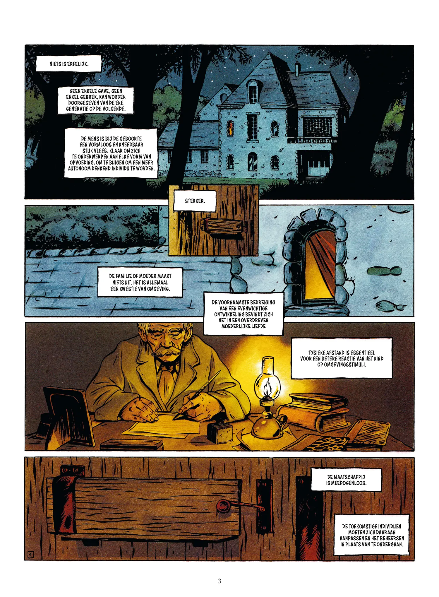 “Niets is erfelijk. Geen enkele gave, geen enkel gebrek, kan worden doorgegeven van de ene generatie op de volgende. De mens is bij de geboorte een vormloos en kneedbaar stuk vlees, klaar om zich te onderwerpen aan elke vorm van opvoeding, om te buigen om een meer autonoom denkend individu te worden. Sterker.”