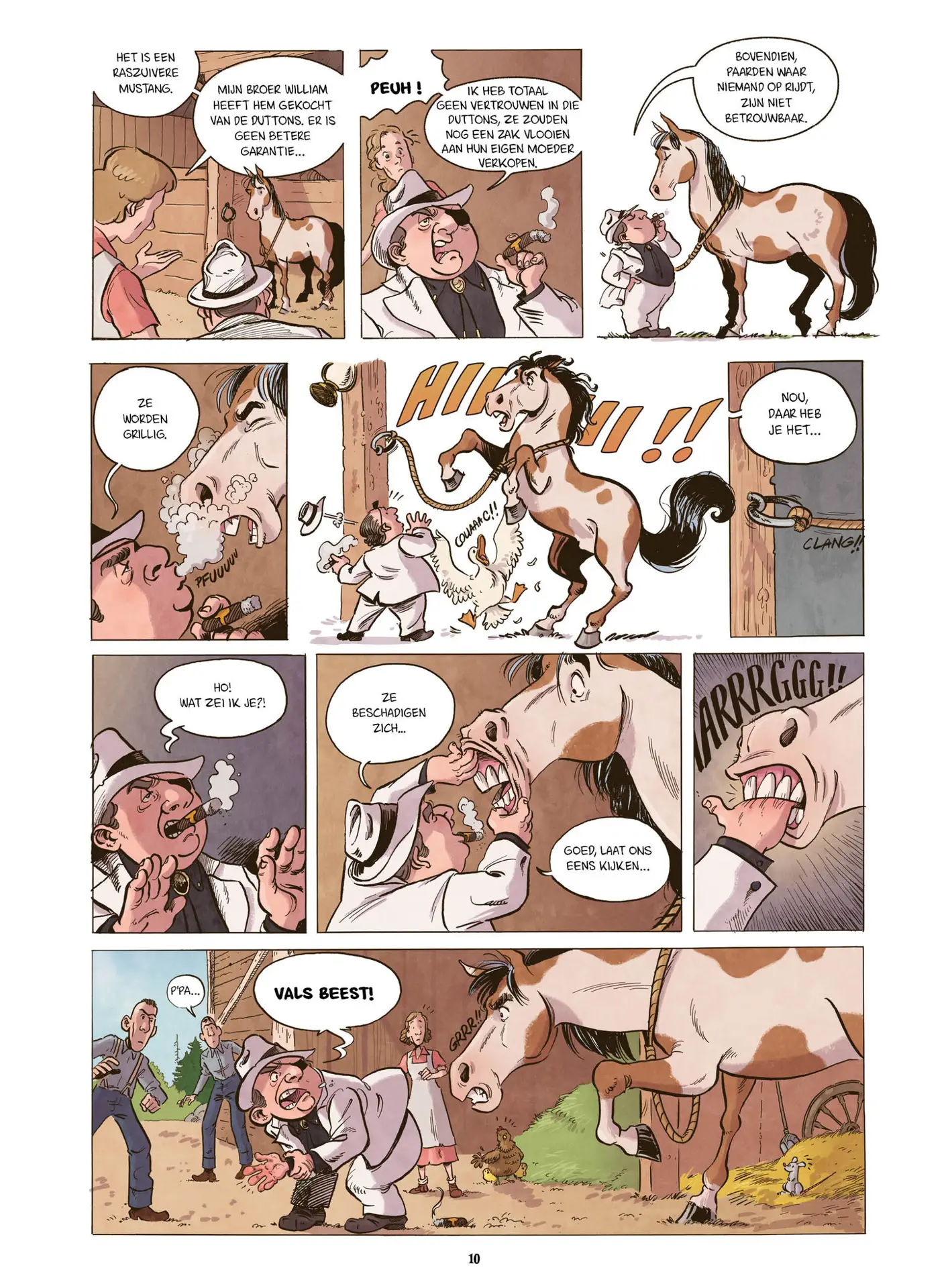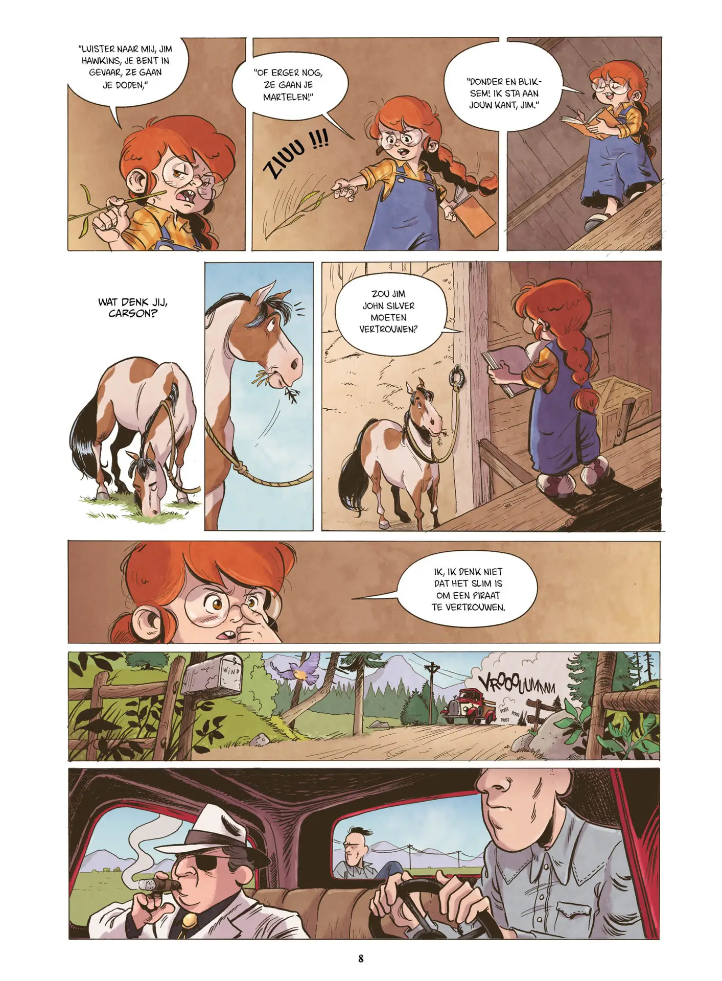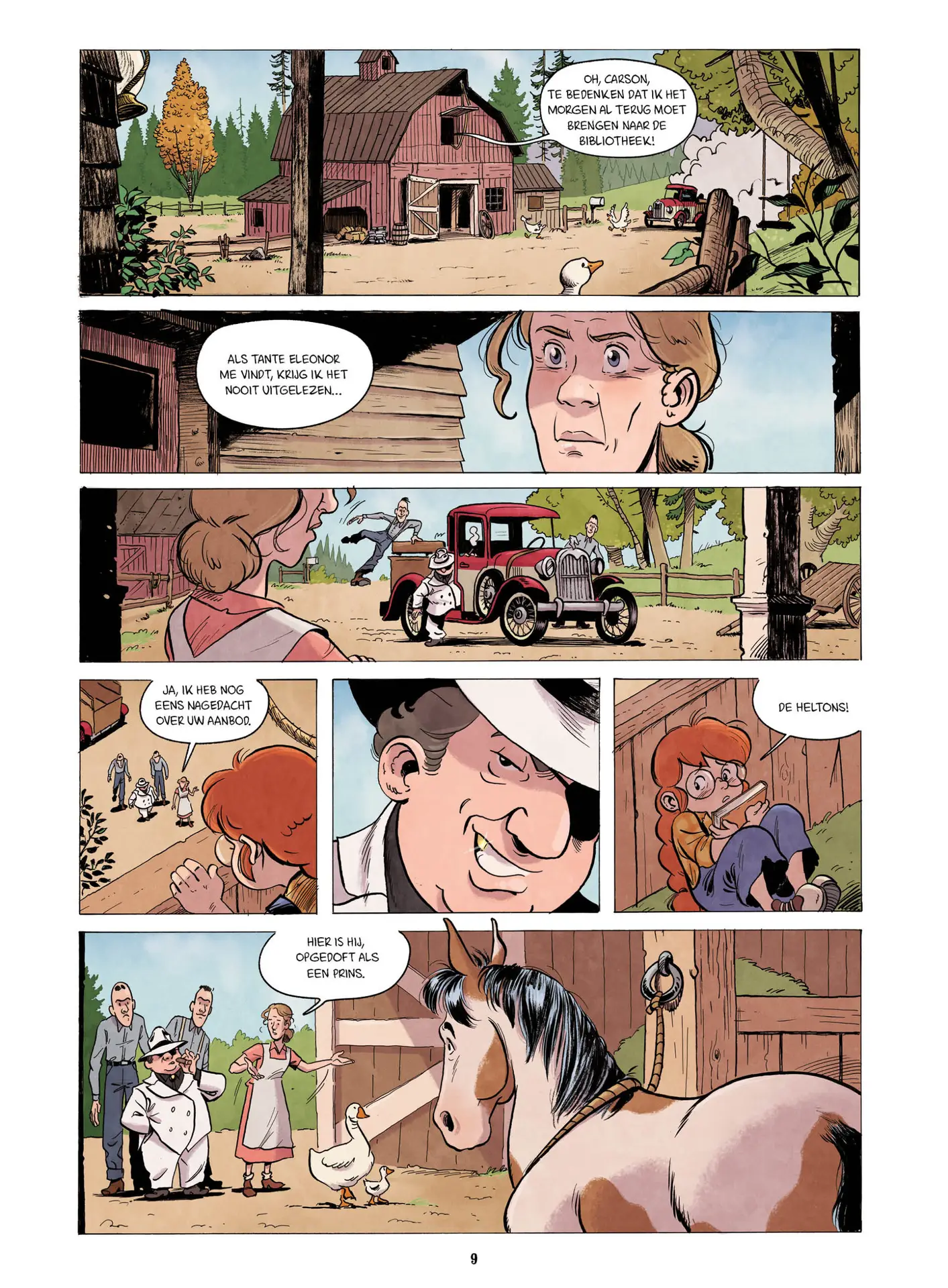 Toni Galmés geeft de strip een heel toegankelijke, ronde tekenstijl die perfect aansluit bij een jong publiek. Molly – met haar lange vlecht, bril en vastberaden blik – is een heldin waar kinderen zich meteen aan kunnen hechten. Naast Carson, het paard dat bijna een knuffel lijkt, bevolken ook vogels, ganzen en zelfs een stinkdier de pagina’s; de dieren geven het geheel een vrolijke, bijna filmische sfeer.